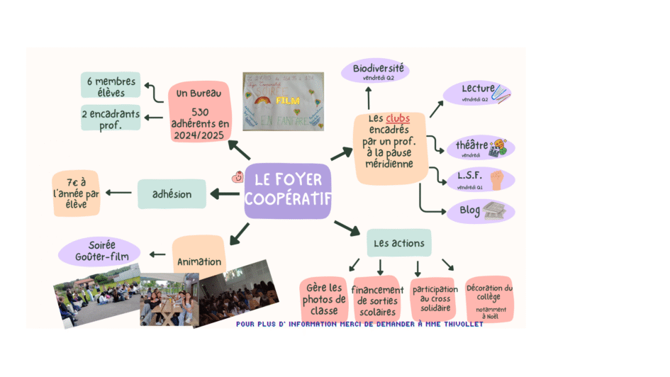 Le Foyer Coopératif est une association au collège qui a pour but d’améliorer la vie du collégien. Cette association s’occupe des photos de classe, etc. Il participe aussi aux financements des sorties, voyages…